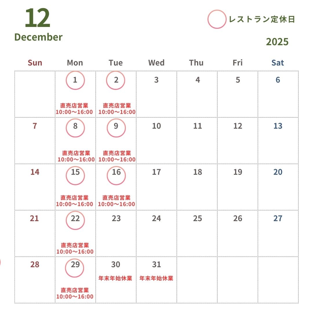 【直売店&直営レストラン】12月営業カレンダー、イベント情報、予約満席情報